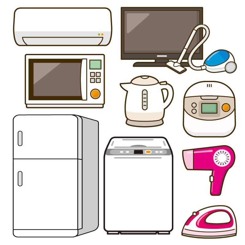 冷蔵庫、冷凍庫、洗濯機、洗濯乾燥機、衣類乾燥機、掃除機、炊飯器、電子レンジ、オーブンレンジ、オーブントースター、電気ケトル、ホットプレート、IHクッキングヒーター、ガスコンロ、照明器具、テレビ、DVDプレイヤー、ブルーレイプレイヤー、HDDレコーダー、ラジカセ、スピーカー、コンポ、電話、FAX電話、ワインセラー、空気清浄機、エアコン、窓用エアコン、ミシンなど。
