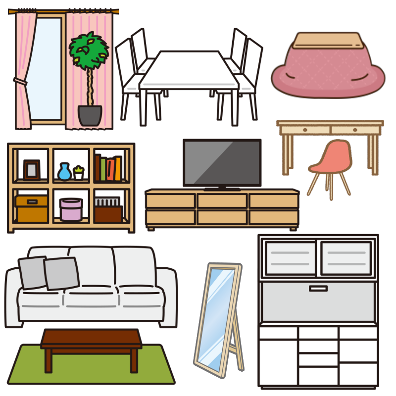 デスク、こたつ、ソファ、食器棚、食卓テーブル、カラーボックス、テレビ台、カーテン、棚などの家具やインテリ小物なども!