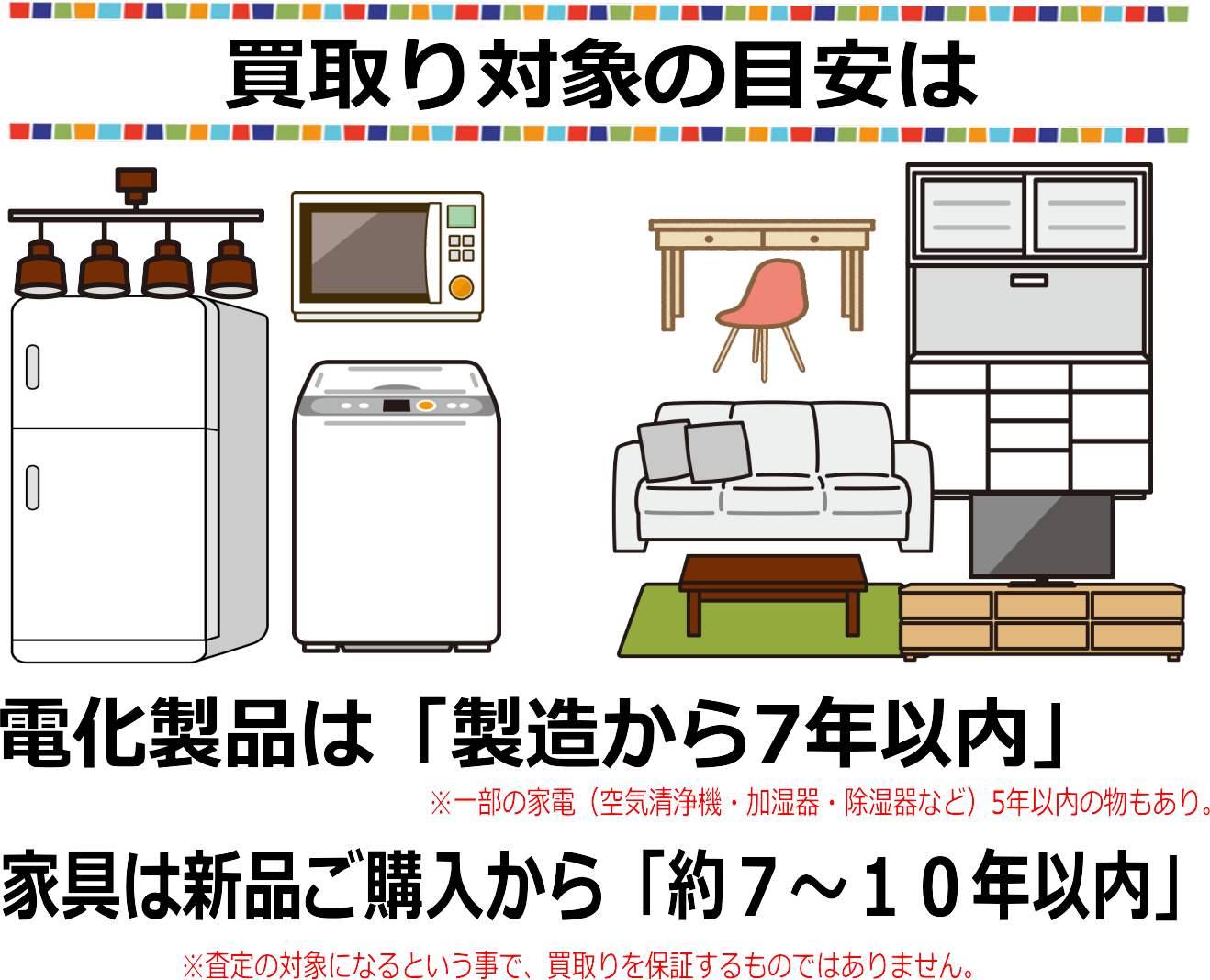 製造から7年以内の物が査定の対象となります。但し、一部エアコンや空気清浄機など、製造から5年以内の物も御座います。