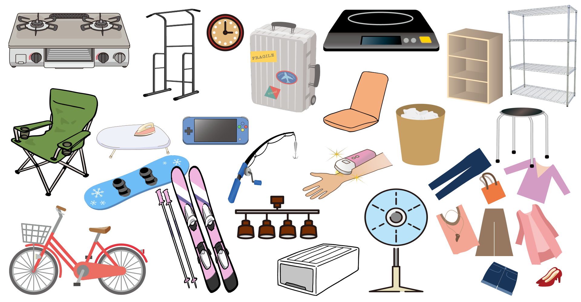 衣装ケースやカラーボックス、スタンドミラーなども買取りでは人気です。自転車や照明器具、スーツケースや衣類なども御座いましたらご遠慮なくお声がけ下さい。