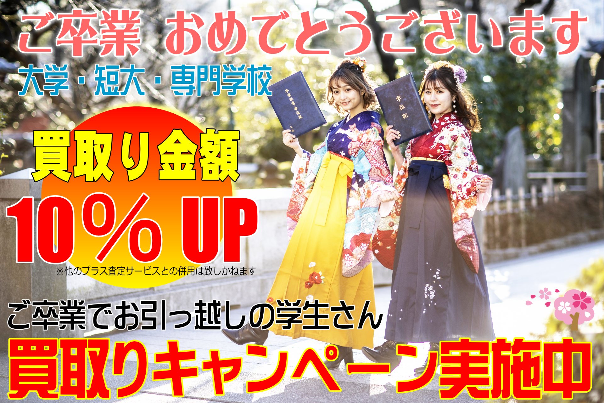 今年ご卒業の学生さん、新生活応援 買取り額 10%アップキャンペーン! 2026年4月12日 お引き取り分まで。