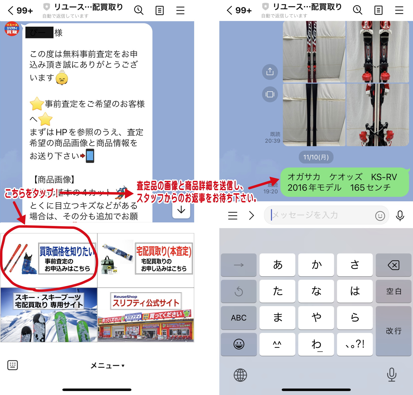 LINE以外での事前見積もりはメールでも承っております。先ずはこちらの「お問い合わせフォーム」から「スキーの事前査定希望」とご連絡ください。折り返しお返事させて頂きます。